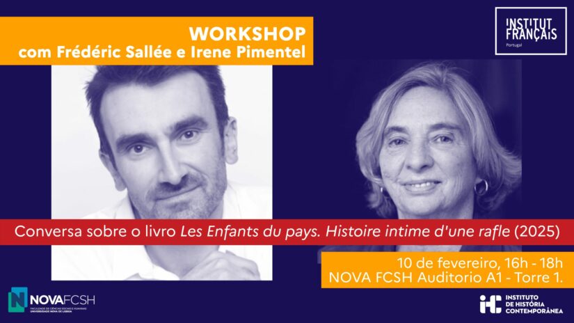 O Institut Français du Portugal e o Instituto de História Contemporânea (IHC) organizam um workshop por ocasião da vinda de Frédéric Sallée a Lisboa, a convite do Liceu Francês. Historiador especializado no nazismo, Frédéric Sallée discutirá o seu novo livro Les Enfants du pays. Histoire intime d’une rafle (2025), juntamente com a historiadora Irène Pimentel. Este livro, que foi galardoado com o prémio Valérien, questiona as memórias familiares e coletivas da Segunda Guerra Mundial e do Holocausto, e valoriza aquilo que uma investigação histórica conduzida nos meandros de arquivos inéditos pode revelar.